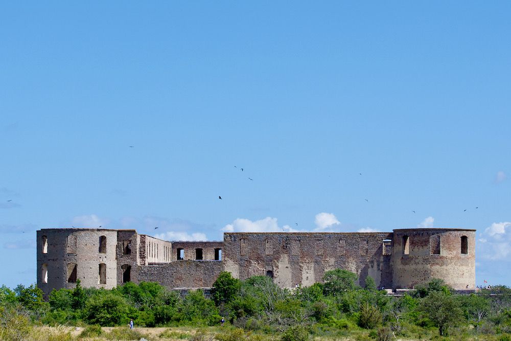 Ruinen av det ståtliga Visingsborgs slott från 1600-talet, beläget vid hamnen på Visingsö i Vättern. En del av slottets södra länga står kvar och syns tydligt från färjan och strandområdet.
